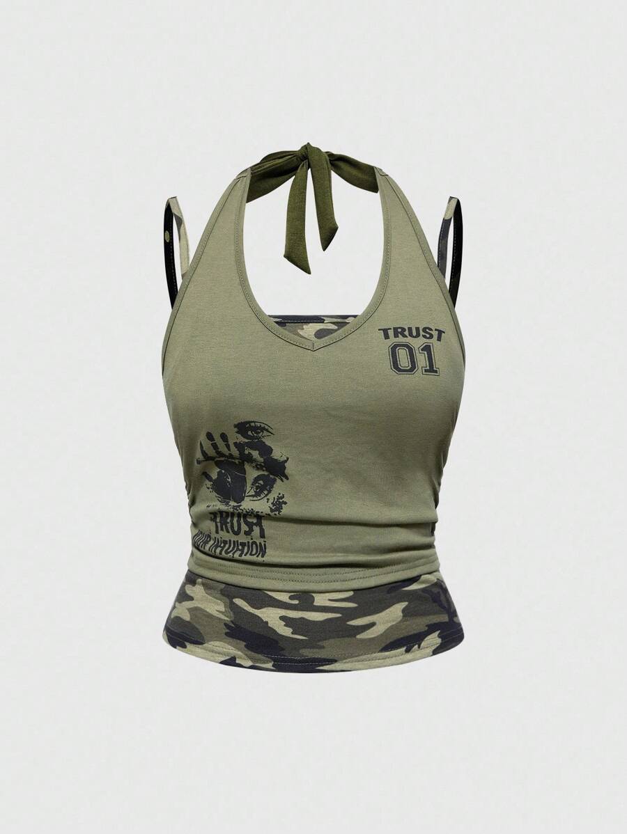 Grunge Punk Top de mujer de cuello halter ajustado de 2 en 1 con estampado de camuflaje Y2K