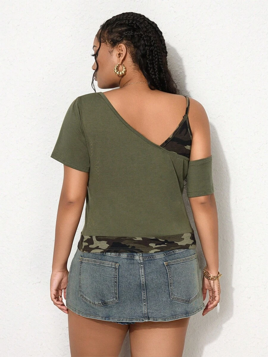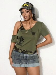 Grunge Punk Camiseta de mujer oversize con estampado de ojo, letra y camuflaje, corte oblicuo en los hombros, estilo retro y grunge Y2K