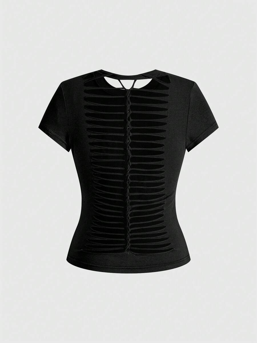 Grunge Punk Camiseta versátil de unicolor, ajustada, con diseño de remaches y notas musicales láser recortadas, estilo Y2K punk y Kpop