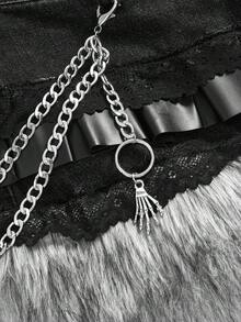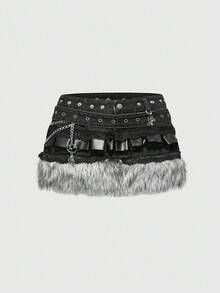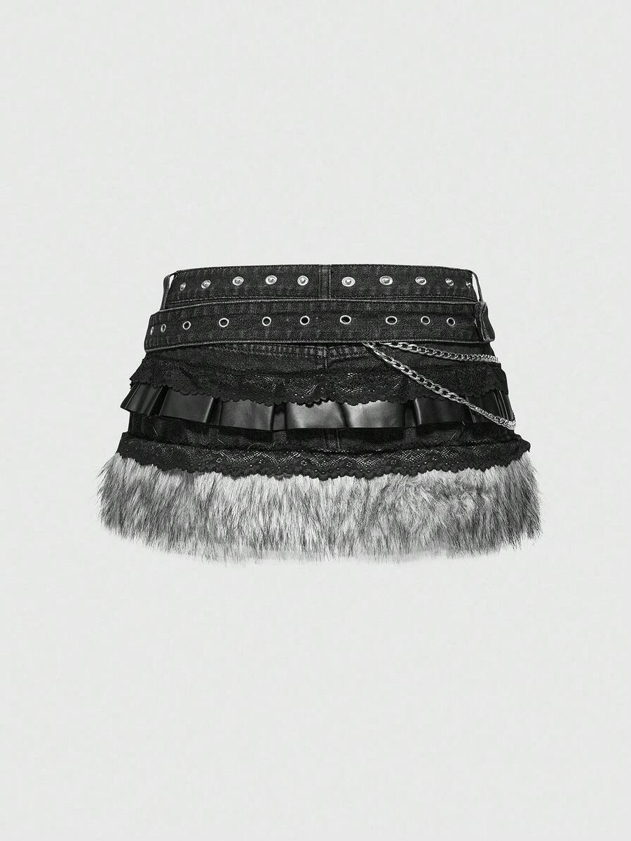 Grunge Punk Minifalda de mezclilla súper corta con colgante de araña y calavera de metal, estilo vintage patchwork y peludo de la Y2K