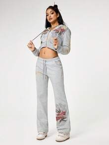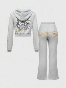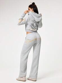 Grunge Punk Conjunto de 2 piezas de sudadera con capucha con cremallera y pantalones con estampado de cabeza de tigre y rosa floral dorado con efecto termoadhesivo con estilo vintage Y2K