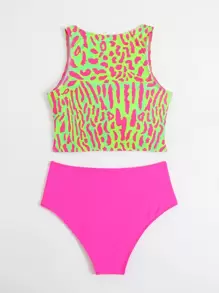 Conjunto de bikini con tankini de nudo frontal y estampado de neón contrastante para la playa de verano